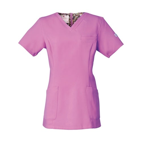 ワンピースのように「はいて着るスクラブ」きれいなシルエットが魅力フェミニンな花柄裏地▼背面の裏地に花柄の生地を使用。脱いだときや動いたときにチラリと見えるかわいいデザイン。 |