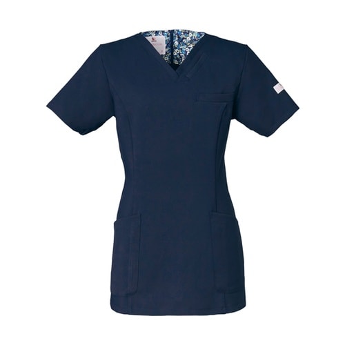 ワンピースのように「はいて着るスクラブ」きれいなシルエットが魅力フェミニンな花柄裏地▼背面の裏地に花柄の生地を使用。脱いだときや動いたときにチラリと見えるかわいいデザイン。