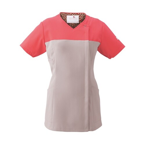 艶やかなバイカラーデザインの着脱しやすいジップスクラブRゴージャスなヒョウ柄裏地▼背面の裏地にヒョウ柄の生地を使用。襟元から女性らしさが見え隠れする、おしゃれなデザインです。 |