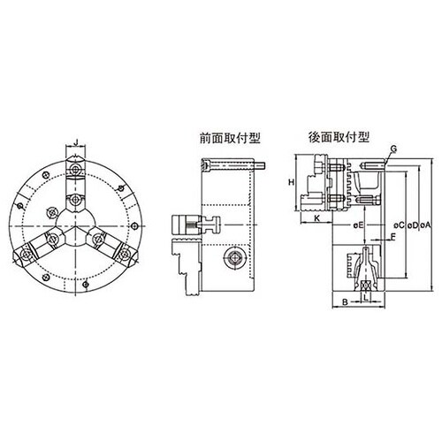 3爪前面取り付けタイプのスクロールチャックです。生爪と硬爪の交換が可能です。(生爪は別売りとなります。 |