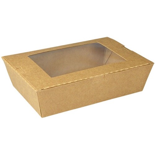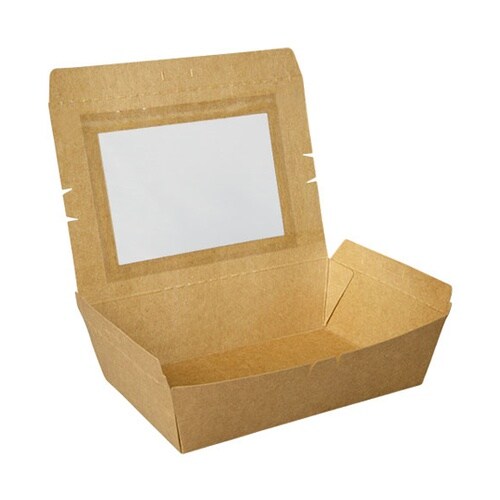 クラフト紙のフードパック。テイクアウトはもちろん、窓付で中身も見えるので、陳列販売にも対応できます。レンジ対応不可。窓フィルムは非防曇です。 |