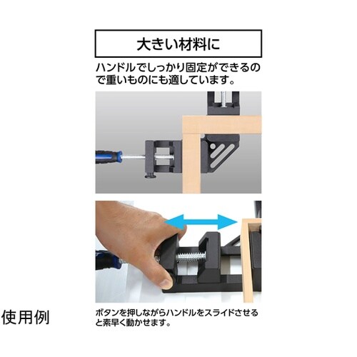 木工作業での材料の固定に使用できます。ハンドルでしっかり固定ができるので大きい材料y重いものに適しています。 |