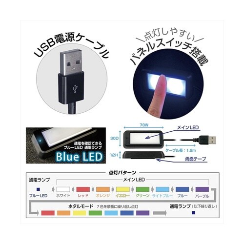 点灯しやすいパネルプッシュ型スイッチ。7色に光るUSB接続のコンパクトアンビエントライト。エンジン停止時の色を記憶するメモリー機能、7色自動切り替え点灯モードあり。USB電源。メモリー機能付き。 |
