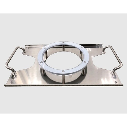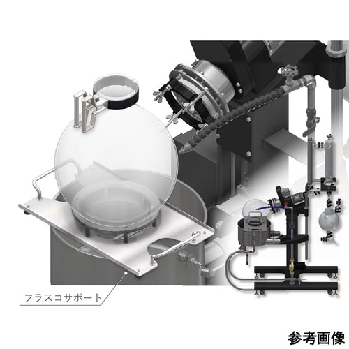 「フラスコサポート」は、ロータリーエバポレーター本体にフラスコを着脱する際に使用するサポート台です。バス上に「フラスコサポート」を設置しフラスコを仮置きすることで、フラスコの落下や破損を防ぎます。 |