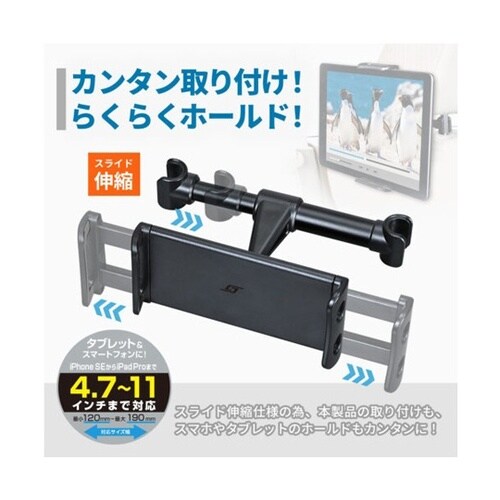 左右のアームがスライド伸縮しモバイル機器を挟んで固定しますお車のシートのヘッドレストシャフト取り付け専用スマートフォン&タブレットホルダーです。 |