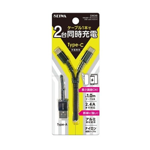 車内用品 USBケーブル Y字 Type−AtoType−C+Type−C 2股 2台同時 D606 60−2377−96 1個