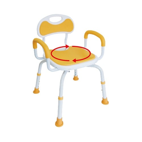 ストッパー解除レバーを押して座面を回転、楽に安定して方向転換が可能です。90度毎にストッパーが効くので、お好きな方向を向いて洗ったり浴槽に向かって立ち上がるなど、洗い場での負担を軽減します。 |