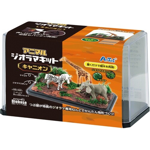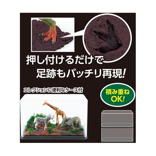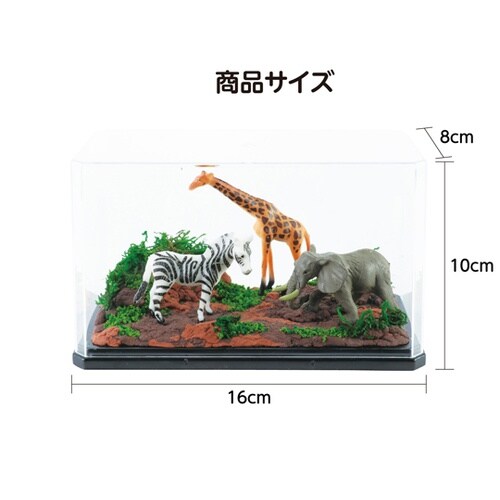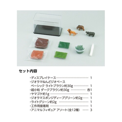 ディスプレイケース付きでそのまま飾れる、本格的なアニマルジオラマキットです。必要な粘土やフィギュアがすべて揃っており、パーツを自由に配置して自分だけのアニマルワールドを作り上げることが可能です。 |