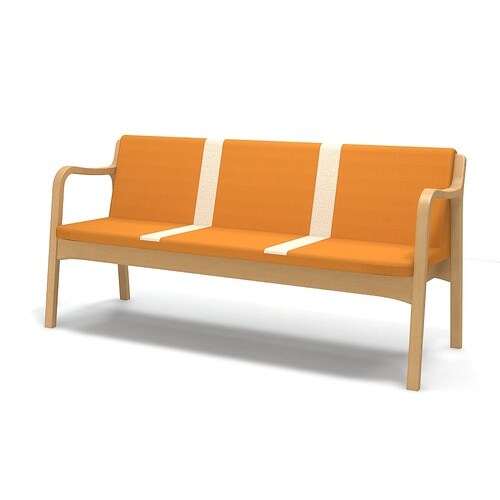 特徴的なアーム形状と座面の奥行を少し浅くすることで患者様の立ち上がりを補助するソファ。張地の張り分けによって各座面の着座位置が視覚化されているため、座面の占有を防止できる。 |