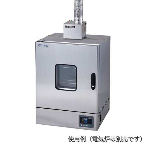 電気炉等から発生する悪臭・ガス等を強制排気させます。付属の排気ダクトを使用し、屋外やドラフト設備へ発生したガス・排煙を移送します。電気炉等の上部には固定バーでしっかりと取り付けることが可能です。 |