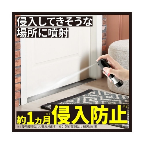 家中使えてまるごと駆除面倒な準備不要侵入防止(※残存薬剤による侵入した害虫の駆除効果)1ヶ月(使用環境により異なります)空間に噴射するだけで、すき間の奥まで薬剤が広がり、家中のムカデを駆除します。 |