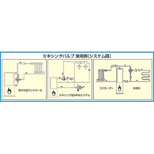 バルブ内蔵サーモエレメントにより、自動的に冷温水のミキシング比率が決定され、設定温度で混合水を放出します。ミキシングをバルブ内蔵サーモエレメントで行う為、電気配線等の作業は不要です。 |