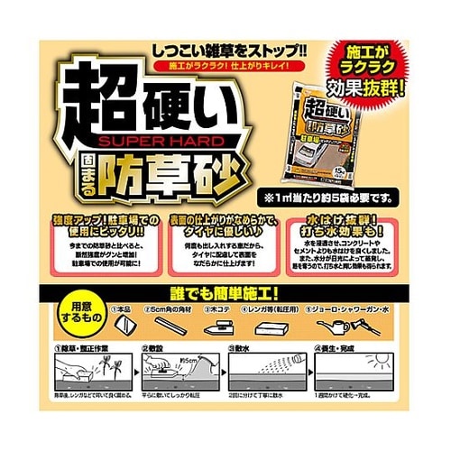 水をかけてから約3日ー1週間で固まる、駐車場に適した固まる防草砂です。水をかけるだけなので、施工が楽々です。耐久性に優れ、水はけがよいです。 |