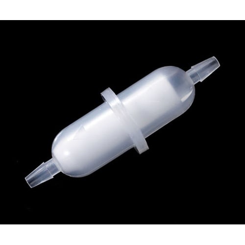 矢印方向へ流れる液体を濾過するポーラスフィルターを内蔵した軟質チューブ用コネクターです。ポリプロピレン(PP)製ホルダーは分解不可。 |