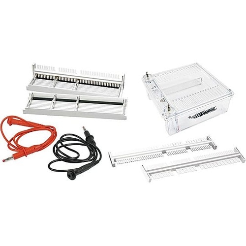 セットに含まれるもの・タンク・リッド各1・ゲル作成スタンドMJ−G01×2・トレイMJ−T02(107x60mm)×2・トレイMJ−T01(52x60mm)×4・黒・赤 電気泳動用ケーブル 各1本・コームMJ−C01×1 片面