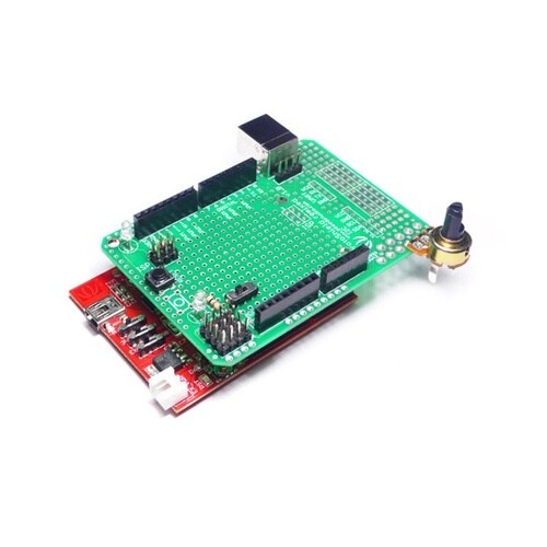 Arduinoのシールドと同一形状のユニバーサル基板とコネクター等基本部品のセットです。独自のシールドを製作できます。 |