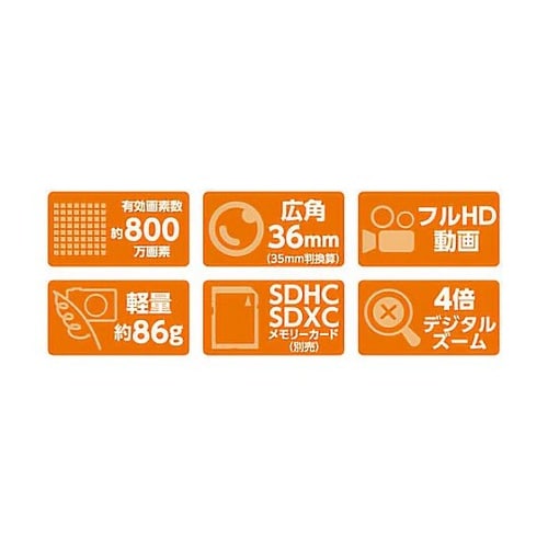 本体約86gと非常に軽く、スリムで小さい為洋服のポケットに入れて気軽に持ち歩けます。フルHD動画撮影が可能です。36mmの広角レンズは、スナップや風景、家族や友人との記念撮影におすすめです。 |