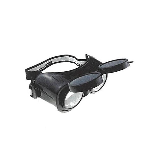 クリアーレンズはフレームに固定されています。グリーンレンズは上に持ち上げることができます。間接的な通気孔で安全です。メガネの上からでも装着可能です。ヘッドバンドは長さ調整が可能です。 |