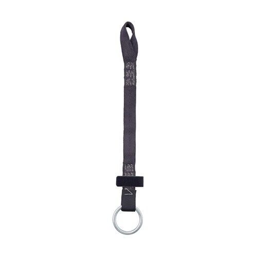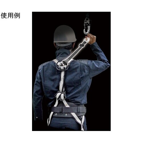 面ファスナーで肩ベルトに留められ邪魔にならない安全ブロックのフックを外した後は、接続ストラップを面ファスナーで肩ベルトに留められるので邪魔にならない。 |