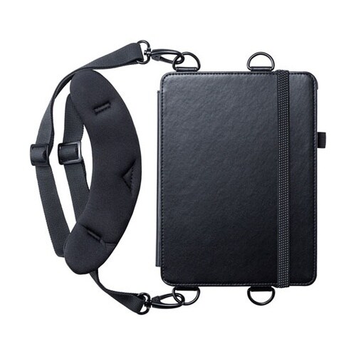 スタンド機能、ショルダーベルト・ハンドベルト・ペンフォルダー付きケース。ショルダーベルト付きで立ったままiPadを操作できるケースです。3段階の角度調節スタンド機能付きです。 |