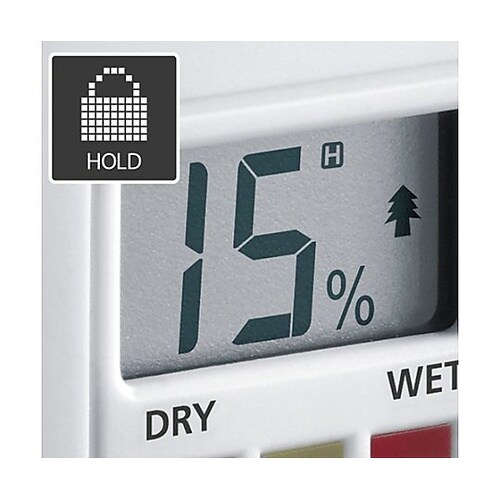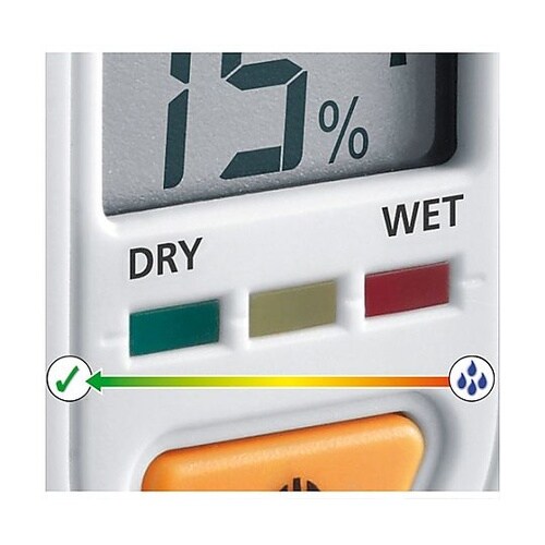 3色のLEDライトで水分含有量を表示します(緑/ドライ 黄色/湿り 赤/ウェット)※付属電池はテスト電池ですので新しい電池をご購入下さい。 |