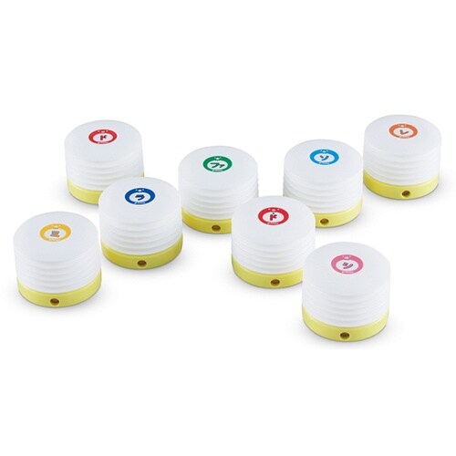 手で押さえるとポンプ内部の空気が押し出され、リードが振動して音が鳴る楽器。1オクターブ8音のセットです。机などに置いて、楽器の打面中央(ドレミシール部)を押さえたり叩いたりして演奏します。 |