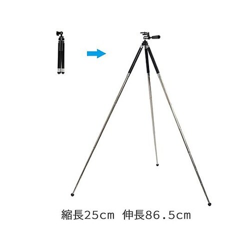 縮めれば携帯に便利なサイズに、伸ばせば撮影に便利なサイズになります。パン棒を緩め、直感的に角度調整を行うことが出来ます。また、カメラを縦向きに固定することも出来ます。 |