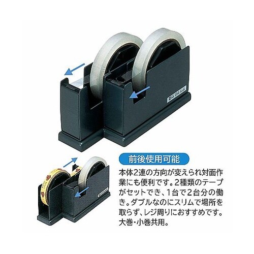 2種類のテープがセットできるお得で便利なペアカッター。前後使用可能:本体2連の方向が変えられ対面作業にも便利です。2種類のテープがセットでき、1台で2台分の働き。 |