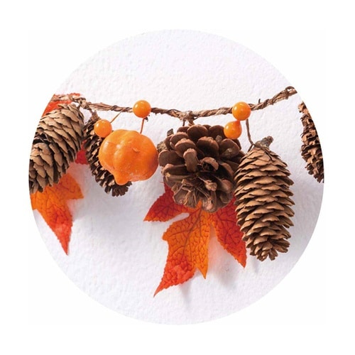 パンプキンや松ぼっくりなど、天然素材をふんだんに組み合わせたガーランド。壁やレジカウンターに吊るしたり、テーブルに置いたり、陳列棚やワゴンや看板に巻いたりして秋らしいディスプレイに。 |