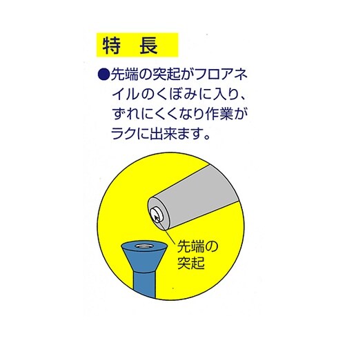 フロア釘の釘しめ作業に最適。先端部の突起部をフロアネイルのくぼみに入り、滑りにくく、効率良く作業が行えます。 |