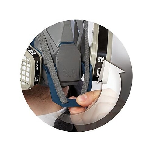 2缶式で呼吸の負担を軽減し、快適に作業が行えます。クイックラッチ操作でワンタッチで素早く顔からマスクを外すことができます。ヘルメットを着けたままでもマスクの着脱が可能です。 |