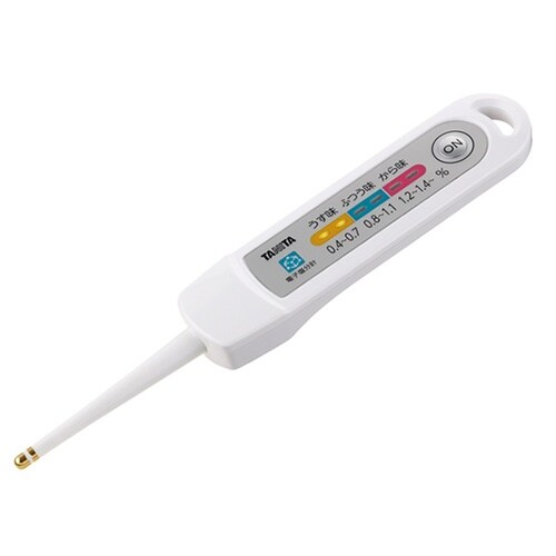 「安心して細かく塩分をチェックしよう」食品に触れる部分にビスフェノールA(BPA)を含まない樹脂を使用。生活防水(IPX4)。塩分濃度を6段階のLEDで表示。30ー90℃まで測定可能。 |