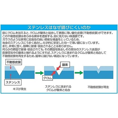 六角形の転がり防止機能により、作業場で転がるのを防ぎます。人間工学に基づいてデザインされたハンドルは手の負担を軽減します。ステンレス製の素材に対してステンレスの工具を使うことでもらい錆を防ぎます。 |