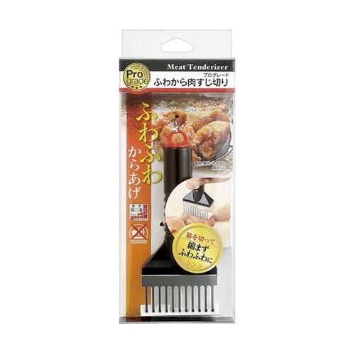 ご家庭で柔らかくジューシーなから揚げを手軽につくれるお肉に数カ所刺して筋を切ることで火を通しても縮まず、ふわふわなから揚げに切り味のよい刃握りやすいハンドルです。 |