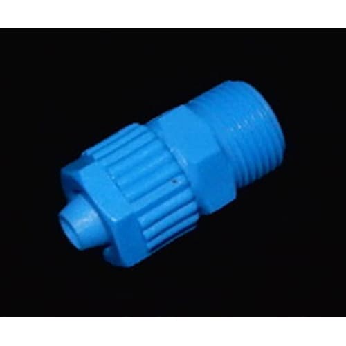 ポリエチレンやフッ素樹脂など半硬質チューブ用で、R3/8インチオスまたはRc3/8インチメスネジ付きです。コネクター部はナットを締め付け強固なチューブ接続ができるチューブロック式です。 |