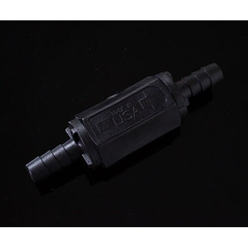 矢印方向へしか液体やガスを通さないようにスプリング式ボール弁を内蔵した軟質チューブ用逆流防止コネクターです。