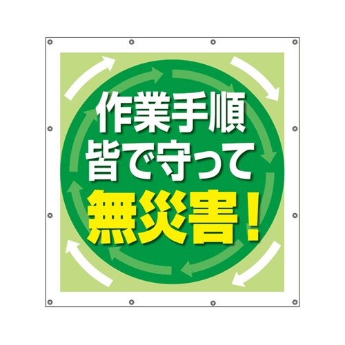 サイズ:900×850×0.41mm厚 | 材質:ビニールターポリン | 標識:作業手順みんなで守って無災害 | 単位:1個