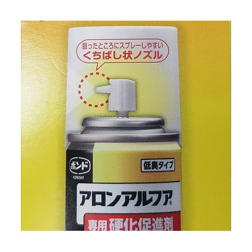 アロンアルファの硬化をさらに速くしたいときに充填・盛り上げ接着白化現象(接着剤の周辺が白くなる現象)の防止に全てのアロンアルファに使用可能です。 |