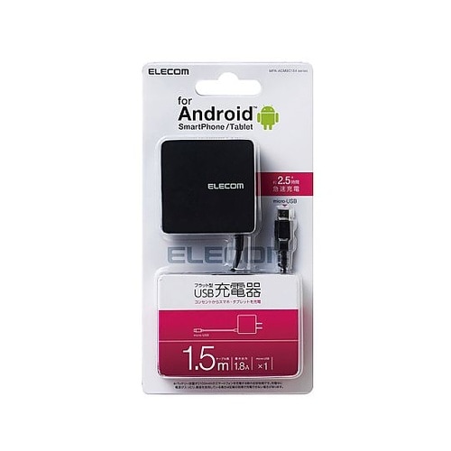 microUSB−Bコネクタを搭載したスマートフォンやタブレットに接続し、家庭用コンセントからそのまま充電できるAC充電器です。1.8Aの高出力タイプなので、タブレットも安心して充電可能です。 |