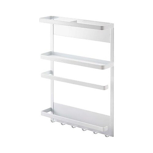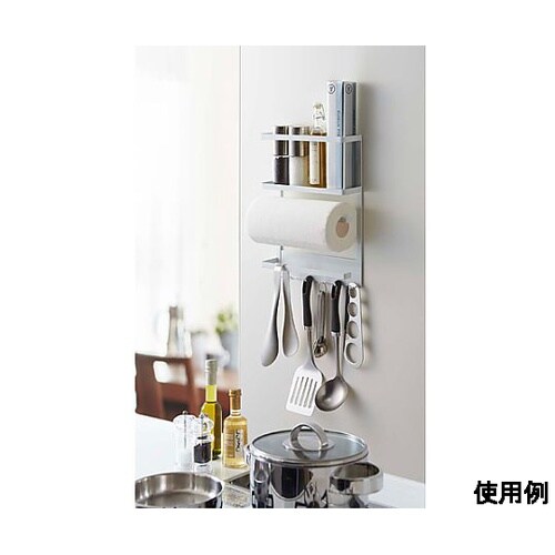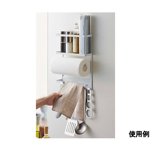 冷蔵庫などの側面に磁石で簡単取り付け。上段には、よく使うラップやアルミホイルを立てて入れることができます。中段には、キッチンペーパーや布巾を掛けられるホルダー付き。 |