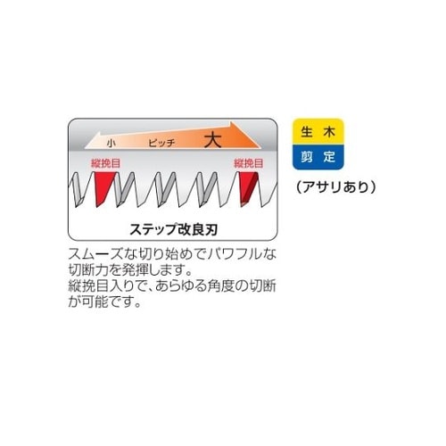 替刃式刃元が細かく刃先につれて荒くなる『ステップ改良刃(当社オリジナル)』はスムーズな切味でパワフルな切断をします。長時間作業でも疲れない『超軽量パワーフィットグリップ』(超軽量130g)を採用。 |