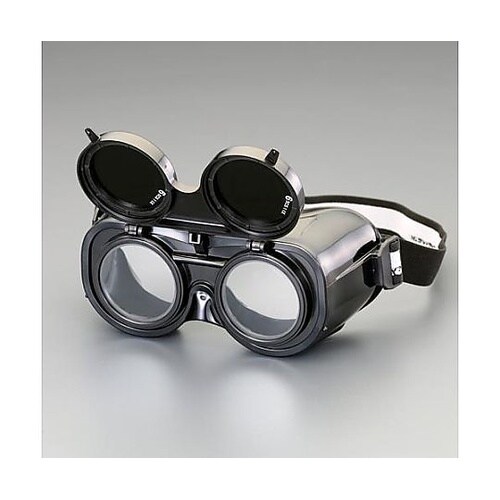 クリアーレンズはフレームに固定されています。グリーンレンズは上に持ち上げることができます。間接的な通気孔で安全です。メガネの上からでも装着可能です。ヘッドバンドは長さ調整が可能です。 |