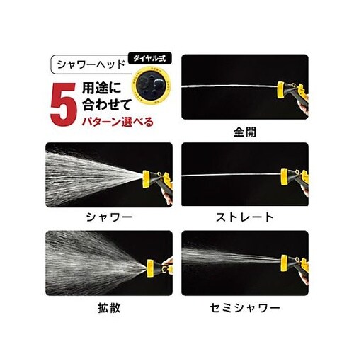 加圧式スプレーシャワーヘッドは使用用途に合わせて、シャワー・全開・ストレート・セミシャワー・拡散の5つの水形が選べます。レバーをロックでらくらく連続散水できます。 |