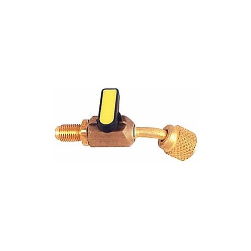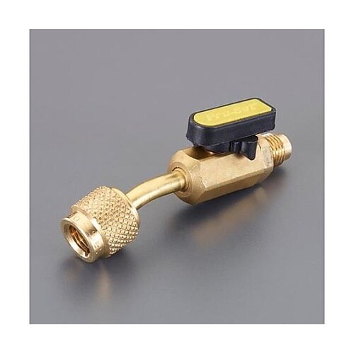 メスフレア側は45°エルボになっています。ハンドルを90°回すだけでガスの流れを止めたり調整できます。 |