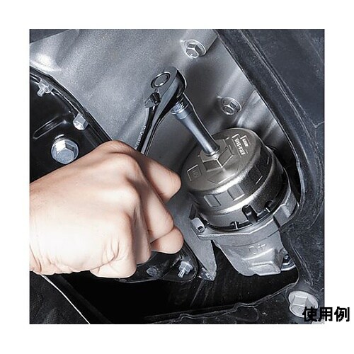 フィルタキャップの突起部(リブ)で駆動するので、噛み込みやすべりを防止できます。フィルタキャップにピッタリ合わせた形状で、プリウス等の作業環境が狭い車種でも使用可能です。 |