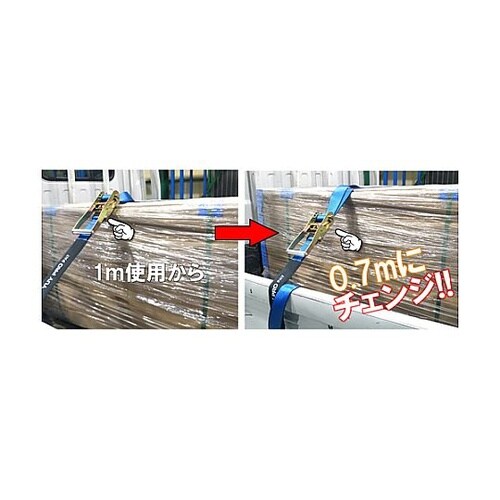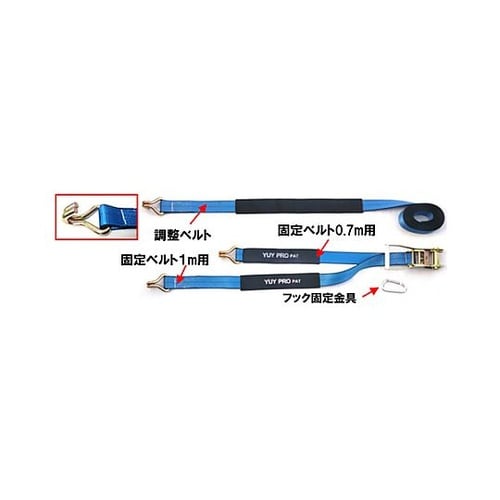 J型フックタイプトラックの荷台の荷物をロープの代わりに使用する荷締めベルトです。 |