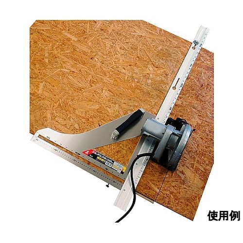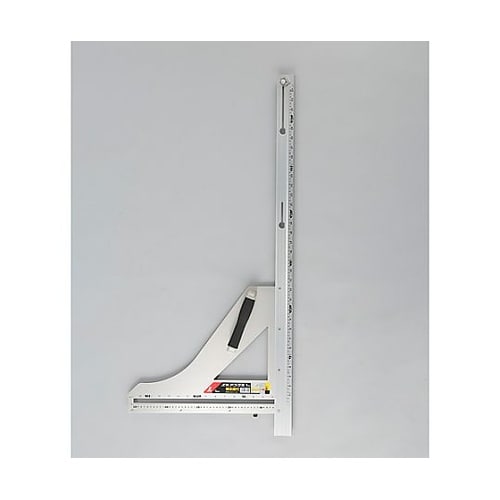 切り出し位置をケガけます。ベースの幅が広いのでしっかりと押さえられます。材料に当てて電気丸ノコを沿わせるだけで、直角に切断できます。大工さんに便利な尺相当目盛とメートル目盛の併用目盛付です。 |