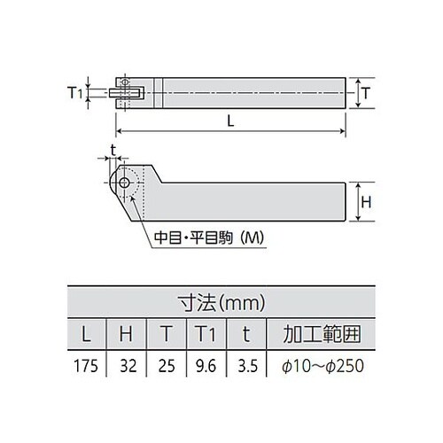 シャンク角:32×25mm | 全長:175mm | 加工可能範囲:φ10〜φ250mm | 材質:特殊合金鋼 | その他仕様:平目用ホルダー | そ…