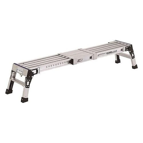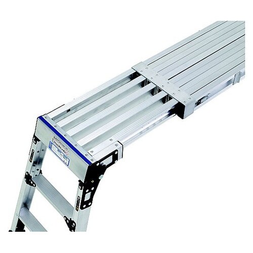 マンションなどの内装工事に最適。作業スペースに合わせて30mmピッチで天板の長さ調整が可能です。下を見なくても台の端を足裏で感知することができる安全機能「足裏感知板」を採用。 |