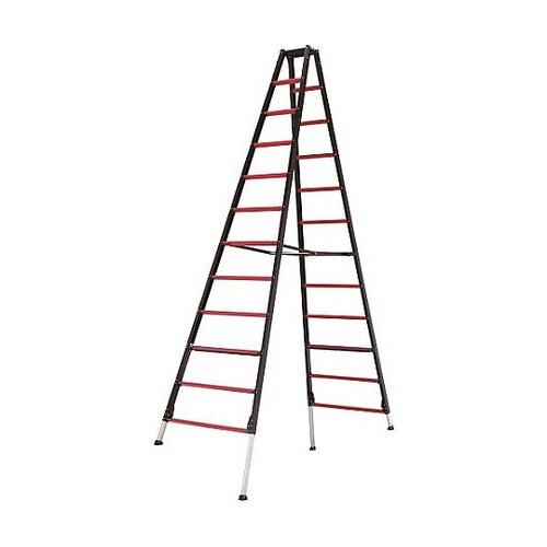 伸縮脚435mmの調整を立ったままできるという進化と踏みざん幅60mmによる安心感を併せ持った新型脚立。本体を持ち上げ、操作レバーを引くと伸縮脚の長さが調整できます。 |